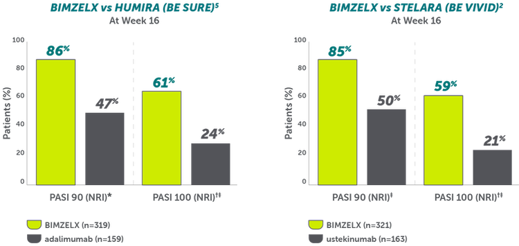 The BE SURE trial showed that at Week 16, PASI 90 and PASI 100 were reached by 86% and 61% of BIMZELX patients vs 47% and 24% of patients receiving adalimumab, respectively.5